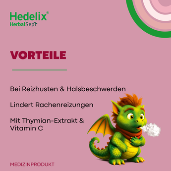 Hedelix® Herbal Sept Husten Lutscher sind ein kindgerechtes Medizinprodukt, das hilft, den Hustenreiz und die Beschwerden Ihres Kindes zu lindern. Damit sich die Kleinen schnell besser fühlen – und auch alle anderen wieder aufatmen können.